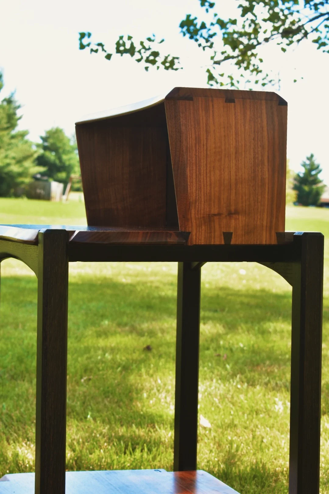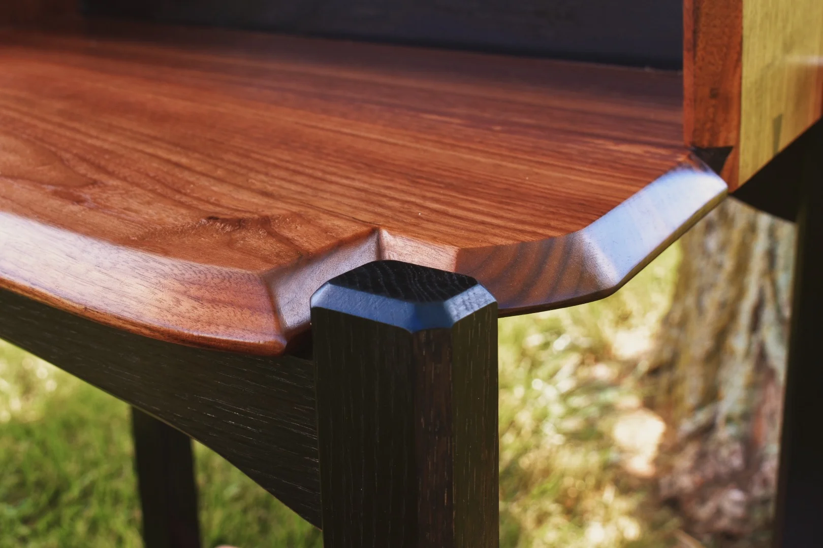 Made in American walnut and ebonized white oak, this nightstand emphasizes open storage and organization. The table’s hood allows for two layers of book/mug/dream journal stacking, while the bottom shelf gives space for magazines to lay fallow and a laptop to charge.